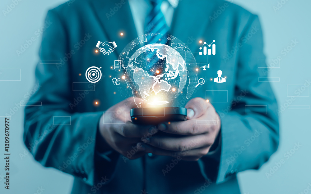 Hands showing the world of digital marketing, business concept, technology, international market, global internet connection, big data, business technology, finance, internet global,